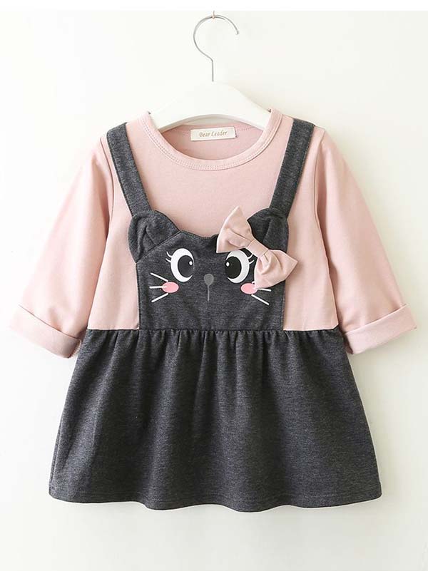پیراهن دخترانه صورتی و طوسی با نمای پیش بند