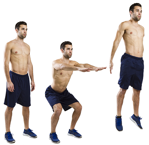 پاها را به اندازه عرض شانه هایتان باز کنید. زانوها را کمی خم کنید و بازوهایتان را در کنار بدن قرار دهید. در این حالت به سمت پایین فشار بیاورید و همزمان به سمت بالا بپرید. زانوها را به سمت قفسه سینه بکشید و همزمان بازوها را باز کنید. زمان فرود زانوها را خم کنید. این اصلی ترین تمرین پلایومتریک است. این تمرین به شما کمک می کند ضربان قلب تان را بالا ببرید و ماهیچه های پایتان را فعال کنید. سعی کنید در هر بار تمرین، ۱۲ بار این حرکت را انجام دهید.