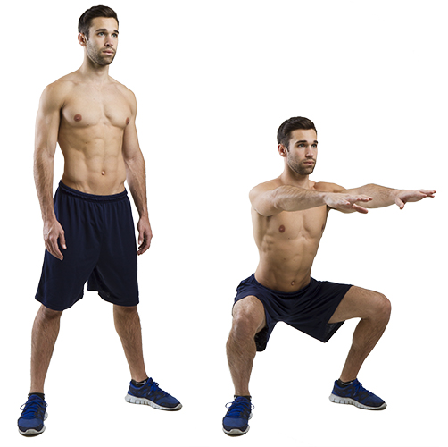 در برنامه ورزشی بدنسازیتان حتماً حداقل یک ست ۱۲ تکراره حرکت اسکات (squat) بگنجانید. این حرکت روی کل عضلات پایینتنه شما کار کرده و تمام عضلات آن را در یک زمان درگیر میکند. برای انجام حرکت اسکاتُ ایستاده و پاها را به اندازه عرض شانهها باز کرده و دستهایتان را در کنار بدن نگه دارید. پشتتان را صاف نگه داشته و به آرامی شروع به پایین رفتن کنید، طوریکه انگار میخواهید عقب روی یک صندلی بنشینید. تا جاییکه زانوها به زاویه ۹۰ درجه برسند پایین بروید، سپس دوباره بالا آمده و در حالت شروع بایستید. برای بالاتر بردن شدت تمرین، میتوانید دو دمبل را در دستهایتان کنار بدن نگه دارید.