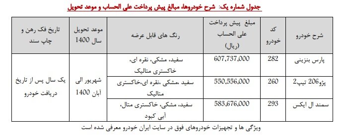 - سمند ال. ایکس با مبلغ پیش پرداخت ۵۸ میلیون و ۳۶۷ هزار و ۶۰۰ تومان