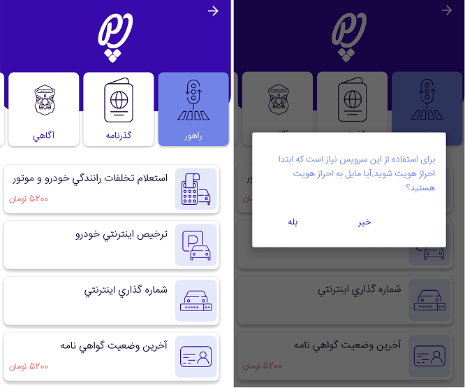 بدین منظور بایستی گزینه «راهور» را انتخاب کنید. سپس گزینه استعلام تخلفات رانندگی خودرو و موتور را انتخاب کنید. در صورتی که برای اولین بار است که از این اپ استفاده می‌کنید، بایستی احراز هویت شوید. از همین رو با انتخاب «بله» به صفحه احراز هویت منتقل می‌شوید.