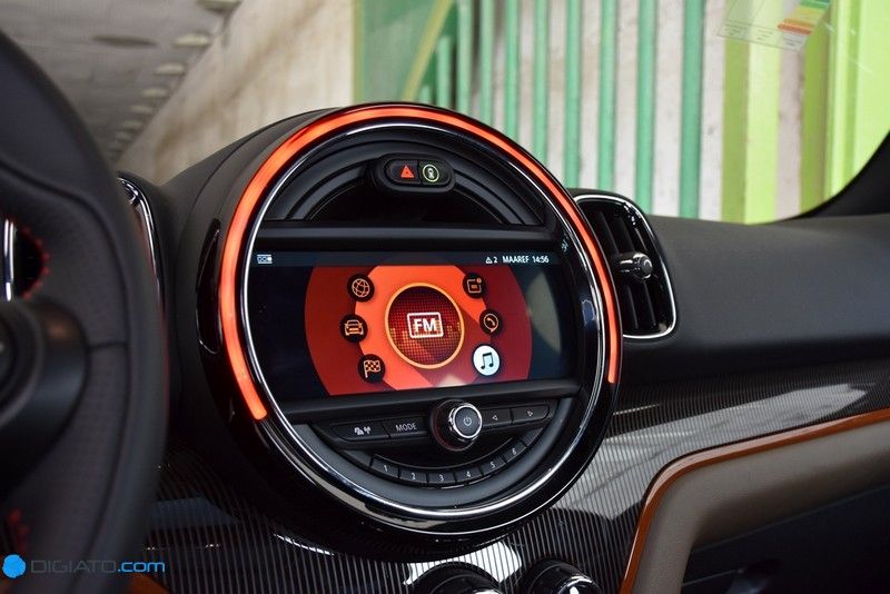در داخل اتاق نیز با طرحی مشابه مینی کوپر طرف هستیم با این تفاوت که به دلیل قیمت بیشتر در مینی کانتریمن سیستم صوتی با طرح خروجی متفاوت، جایگاه متفاوت آمپر سنج که به کلی از کنسول جدا شده است و همینطور طرح متفاوت خروجی سیستم تهویه مطبوع ایستاده با قاب های کرومی کار شده است.