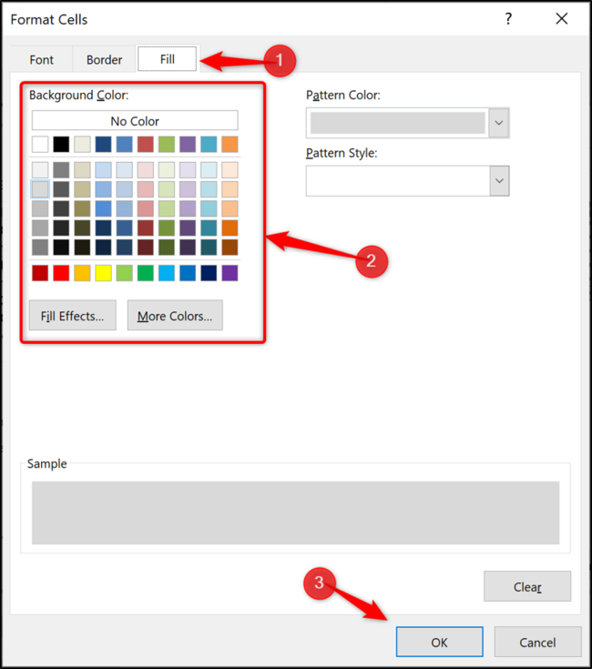 وارد تب Fill شوید. رنگی که میخواهید را انتخاب کنید. دکمه More Colors نمایش داده خواهد شد که چند گزینه رنگی مختلف دارد. رنگ مد نظر خود را انتخاب کنید و در نهایت دکمه OK را بزنید.