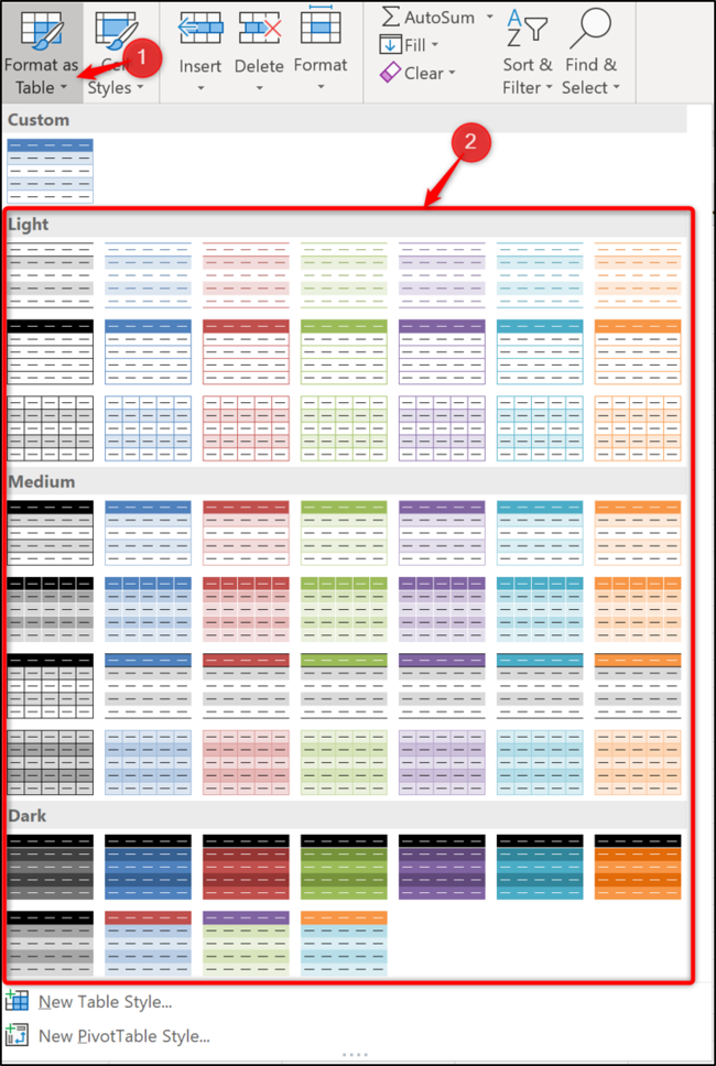 برای این کار ابتدا دادههایی که میخواهید در یک جدول قرار بگیرند را انتخاب کنید. سپس روی Format as Table که در تب Home قرار گرفته کلیک کنید و سپس حالت ظاهری مد نظر خود برای جدول را انتخاب کنید.