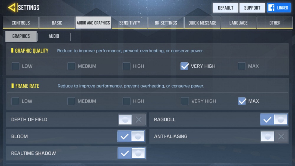 زمانی که برای اولین بار وارد بازی می‌شوید، گوشی‌تان به صورت خودکار تنظیمات گرافیکی را تشخیص می‌دهد، اما می‌توانید خودتان تنظیمات گرافیکی را هم تغییر دهید. برای این کار به بخش Audio and Graphics بروید. در اینجا گزینه‌های مختلفی پیش روی شما قرار می‌گیرد و می‌توانید مواردی مانند کیفیت گرافیک و همچنین فریم ریت را تغییر دهید. مسلما با توجه به قدرت گرافیکی خود باید تنظیمات را تغییر دهید تا تجربه روان‌تری داشته باشید.