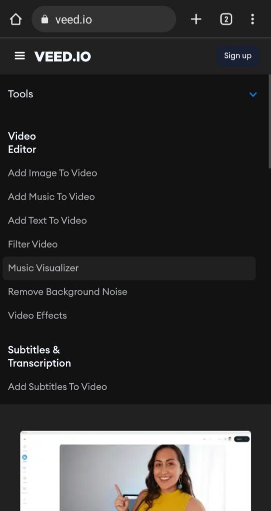 ۲. در صفحه اصلی سایت، روی آیکن همبرگری قرار گرفته در گوشه بالایی صفحه بزنید و از منوی Tools گزینه Music Visualizer را لمس کنید.