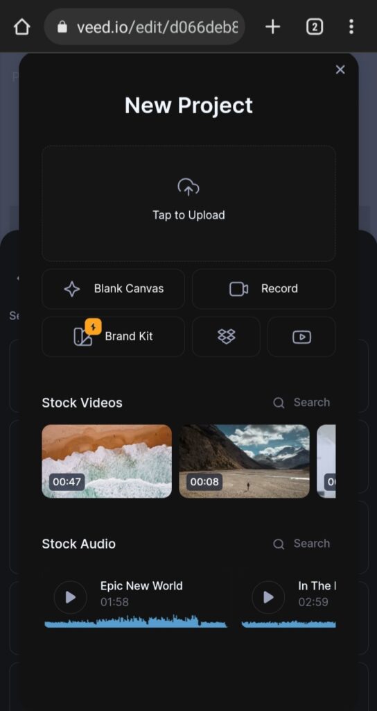 ۴. اکنون وارد قسمت ویرایشگر و مدیریت پروژه سایت خواهید شد. روی کادر Tap to Upload در قسمت بالایی صفحه و در زیر عنوان New Project بزنید و یک عکس پسزمینه برای ویدیو اکولایزر خود انتخاب کنید. در صورت علاقه میتوانید به جای تصویر ثابت، از یک ویدیو به این منظور استفاده نمایید.