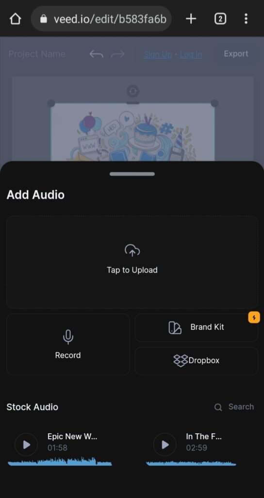 ۶. برای ادامه کار و افزودن فایل صوتی به پروژه، به تب Audio بروید و سپس روی گزینه Tap to Upload بزنید. حالا آهنگ مورد نظر خود را انتخاب کرده و صبر کنید تا فرایند بارگذاری آن به اتمام برسد. پس از آن، مشاهده خواهید کرد که نوار اکولایزر در پایین تصویر پسزمینه نمایش داده خواهد شد و متناسب با موسیقی حرکت خواهد کرد.
