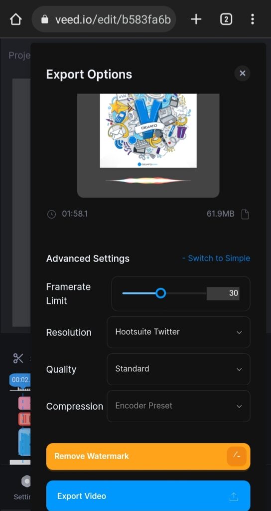 ۷. برای تهیه فایل خروجی روی گزینه Export بزنید. در ادامه میتوانید حجم نهایی فایل را مشاهده کنید. برای کاهش این مقدار، گزینه Switch to Advanced را لمس کرده و سپس مقدار فریم ریت را کاهش دهید. همچنین در قسمت رزولوشن شبکه اجتماعی مورد نظر یا گزینه 480p را انتخاب کنید و گزینه Quality را هم روی حالت Low قرار دهید. در پایان کلید Export Video را در پایین صفحه لمس کنید. پس از اتمام پردازش، میتوانید فایل را به صورت آنلاین مشاهده کرده و آن را به صورت روی حافظه داخلی دستگاه خود دانلود نمایید.