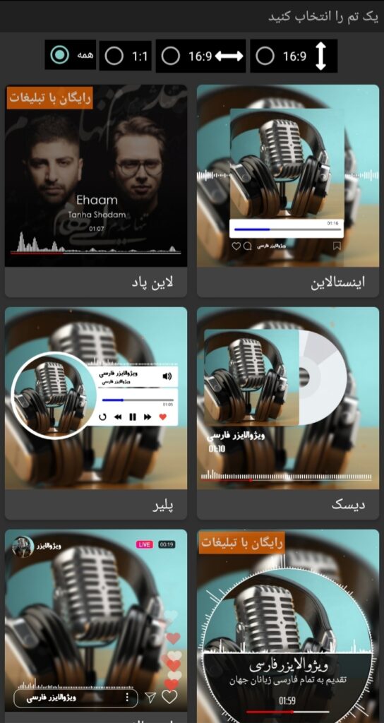 ۳. در صفحه انتخاب موزیک، فایل آهنگ مورد نظر را از میان موارد ذخیره شده روی دستگاه انتخاب نمایید. پس از آن به صفحه انتخاب قالب خواهید رسید. قالبهای مختلف در نسبتهای تصویر ۱ به ۱ و ۱۶ به ۹ همراه با ۹ به ۱۶ قرار گرفتهاند که امکان فیلتر کردن آنها با توجه به همین مورد هم وجود دارد. شایان ذکر است که برخی از آنها کاملا رایگان، بعضی رایگان با تبلیغات و برخی دیگر هم به صورت پولی در اختیار قرار دارند.