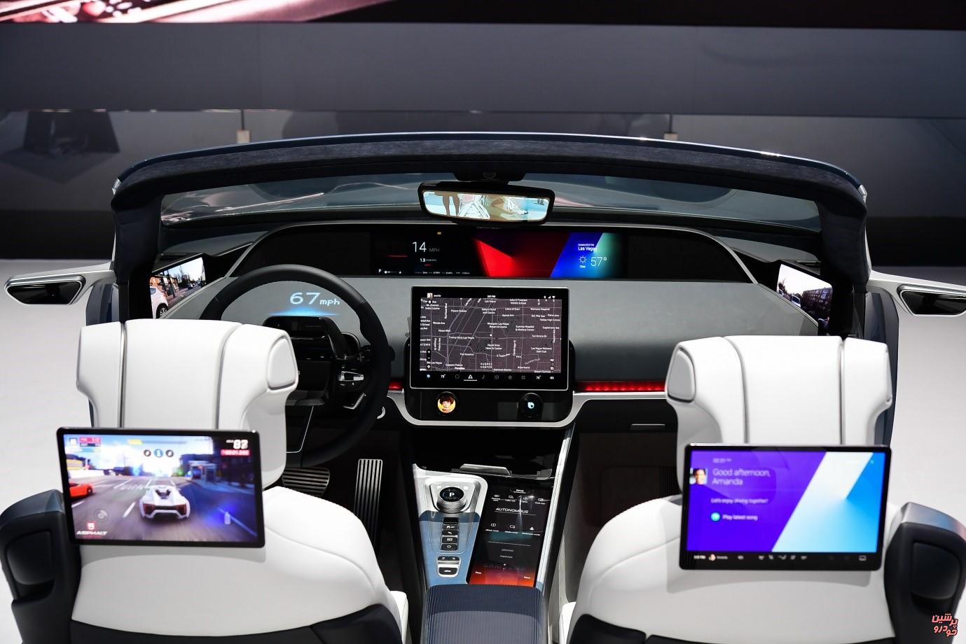 یک خودروی خودران در خیابان شهری هوشمند با خطوط نورانی که اتصالات داده را نشان می‌دهند.